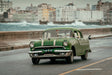 Bilden visar en amerikansk vintage bil, en Pontiac, som används som taxibil i Havanna, Kuba. Den gröna färgen på bilen skapar kontrast mot den färgglada karibiska miljön. Detta är verkligen en unik och intressant bild som ger en genuin känsla av gamla tider.