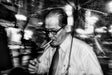 Mannen, som bär glasögon och röker en cigarett, ger bilden en känsla av coolhet och en känsla av ensamhet i den travande stämningen. Ljuset från hans tändare skapar en unik kontrast mot den mörka bakgrunden och lägger till en extra touch av drama.