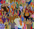 Bilden är fylld med abstrakta former och människor som skapar en känsla av en fullsatt arena under en spännande sportevenemang. Färgerna är levande och sprudlande, vilket ger verket en glad och livlig karaktär.